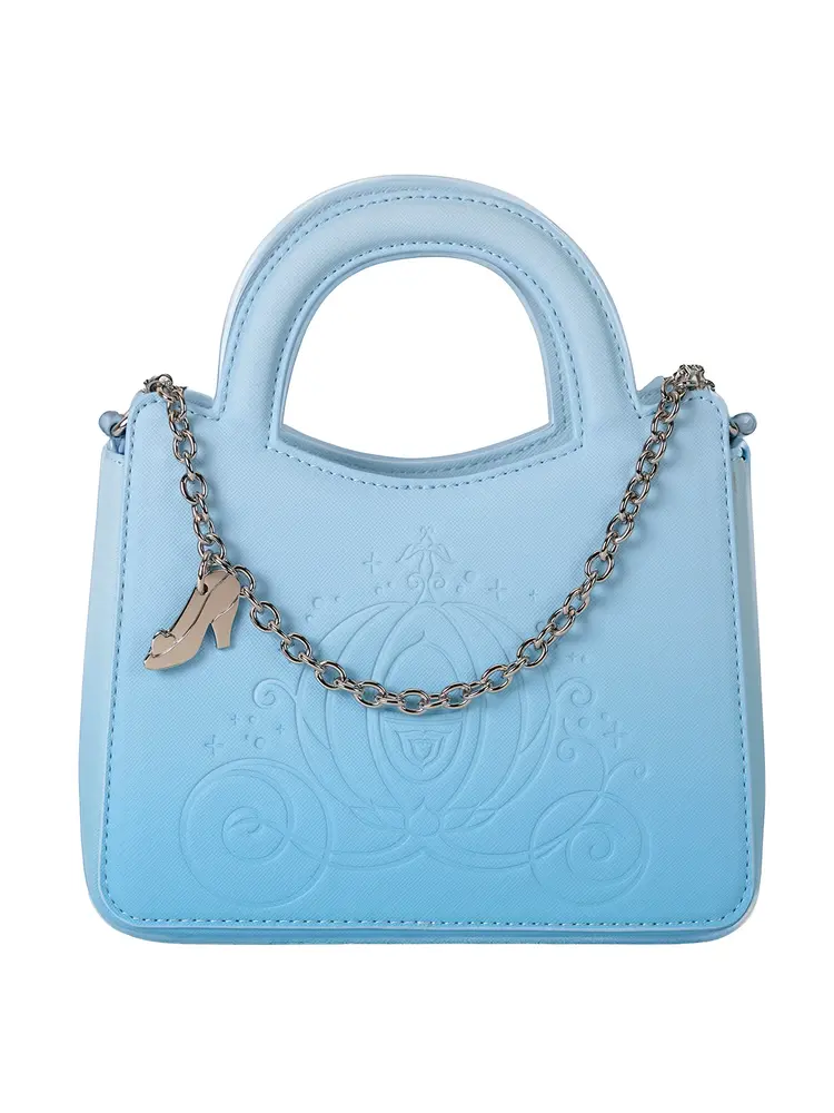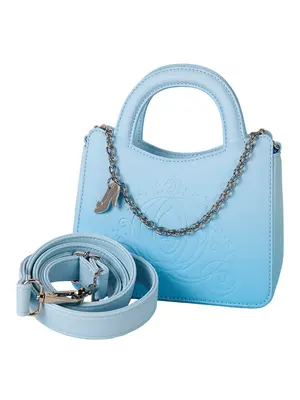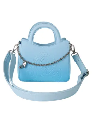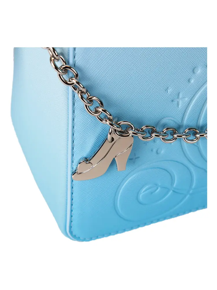 Step into your glass slippers and have a ball! This Disney’s Cinderella crossbody bag in light blue is ready to make a stunning entrance for a 75th-anniversary celebration. The front features an elegant, debossed print of Cinderella’s carriage. A silver chain and molded metal charm of her glass slipper add a touch of character. Flip the bag around, and you’ll find a debossed print of the beloved Disney’s characters, Jaq and Gus. Pack just what you need for the day—or an evening—of magical adventures