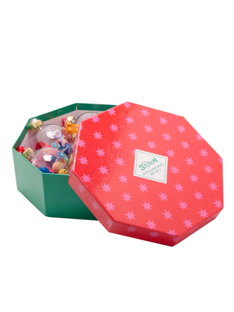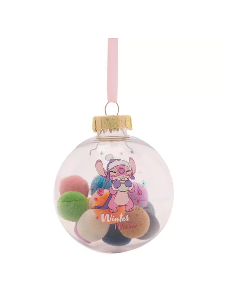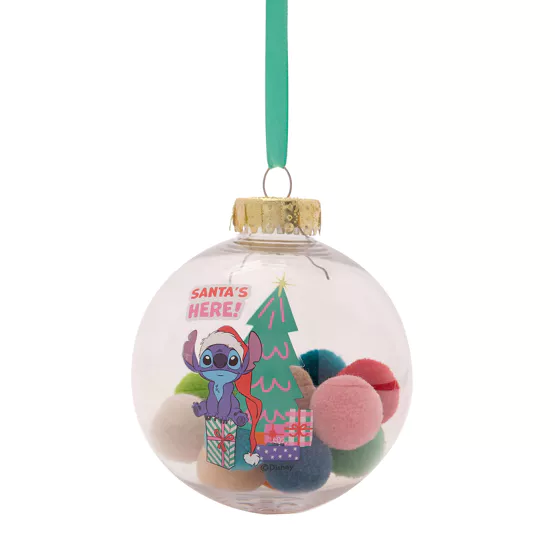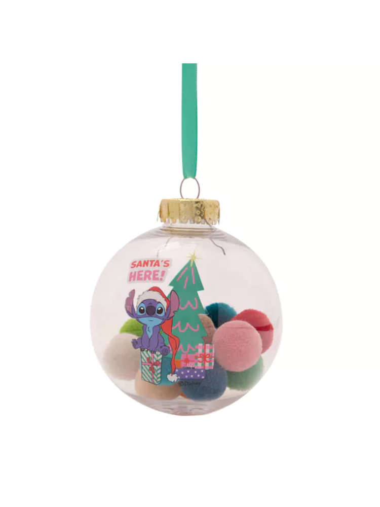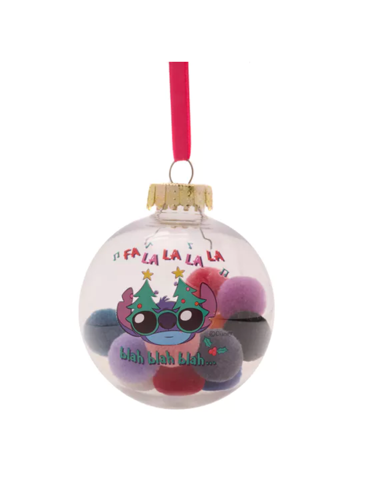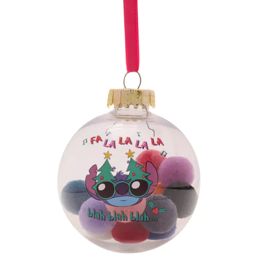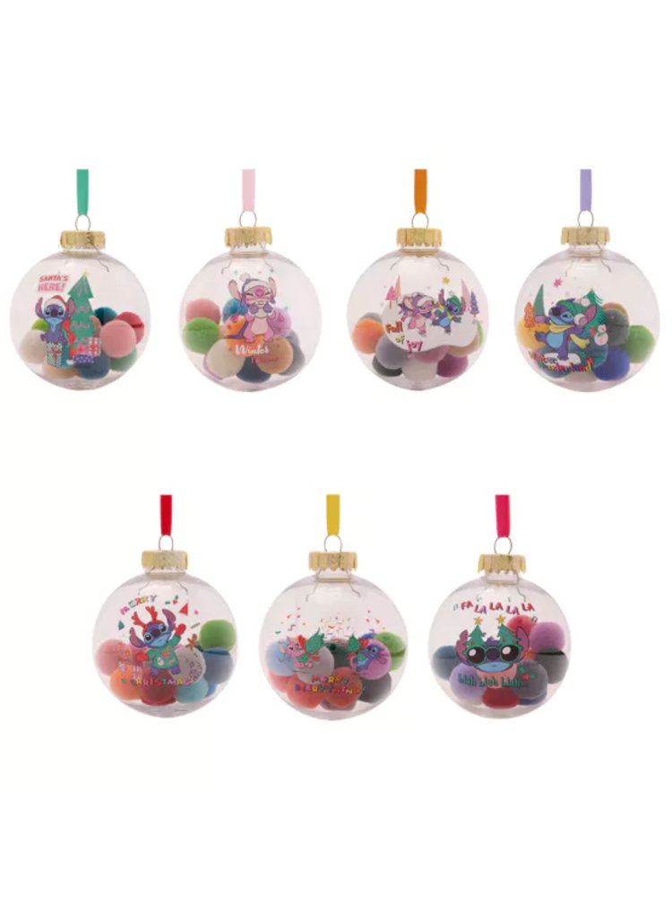 The round, transparent baubles showcase individual festive designs featuring Stitch from Lilo & Stitch, complete with colourful pom poms inside. They hang from the Christmas tree using their eye-catching ribbons.