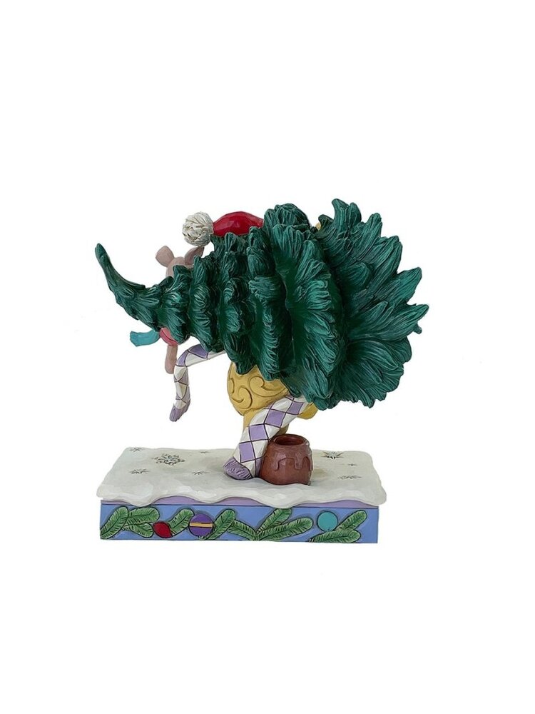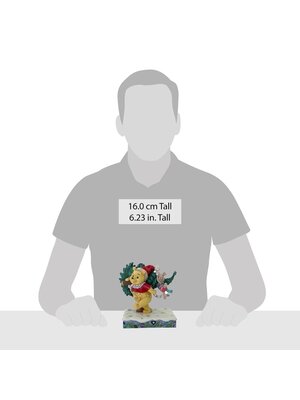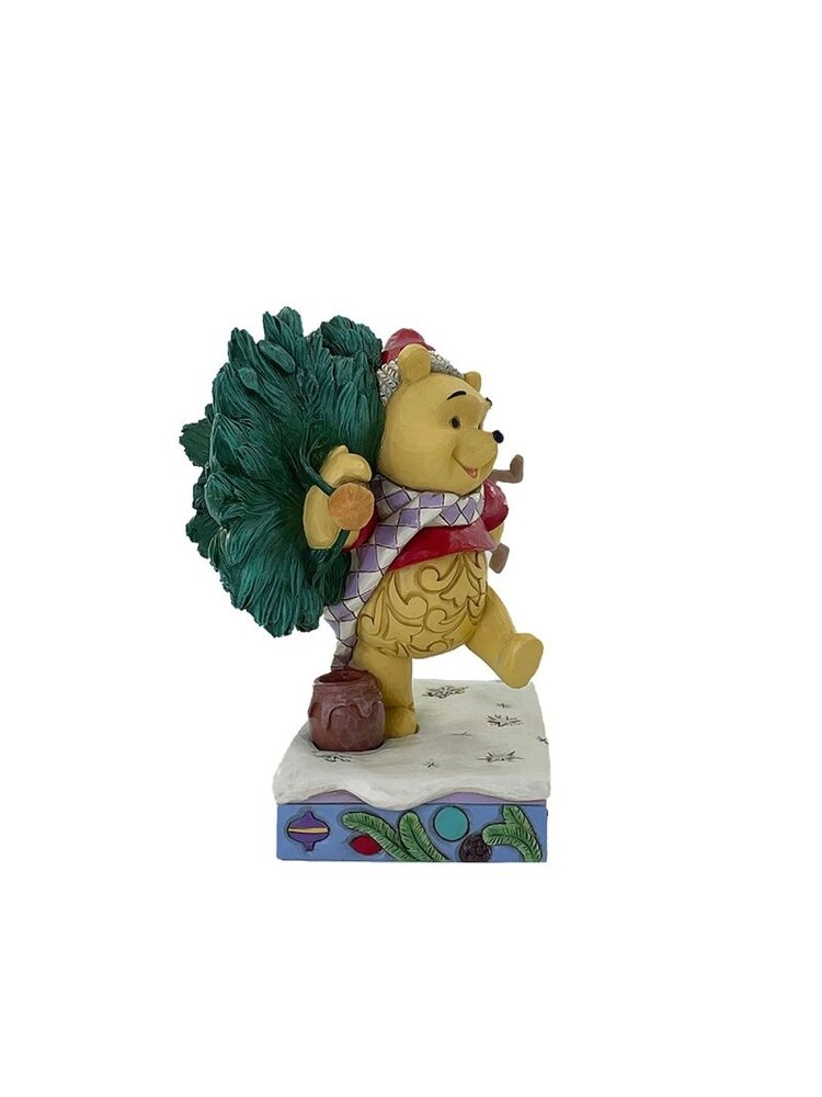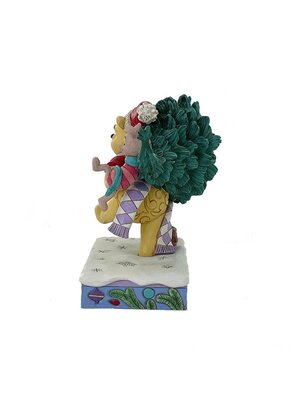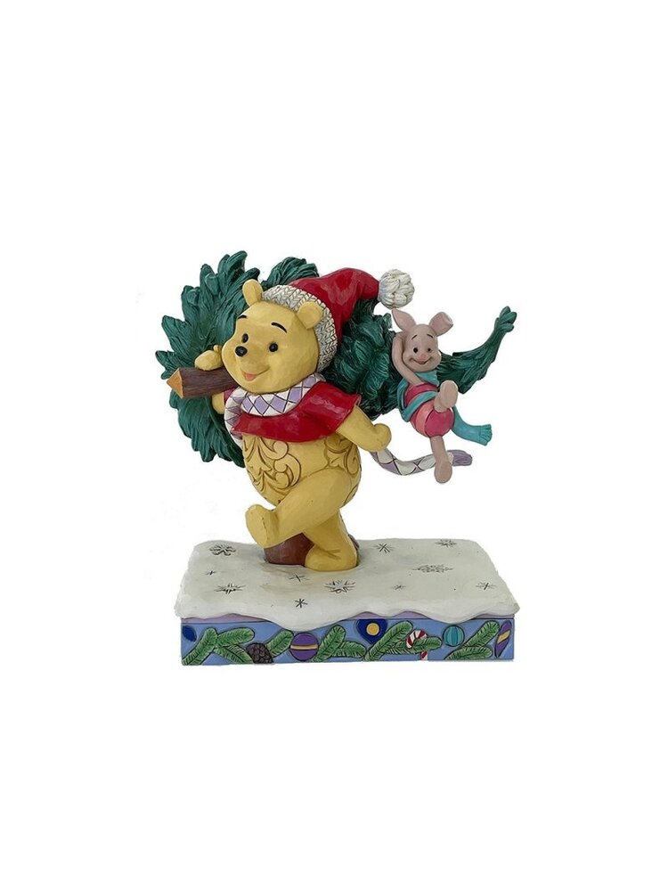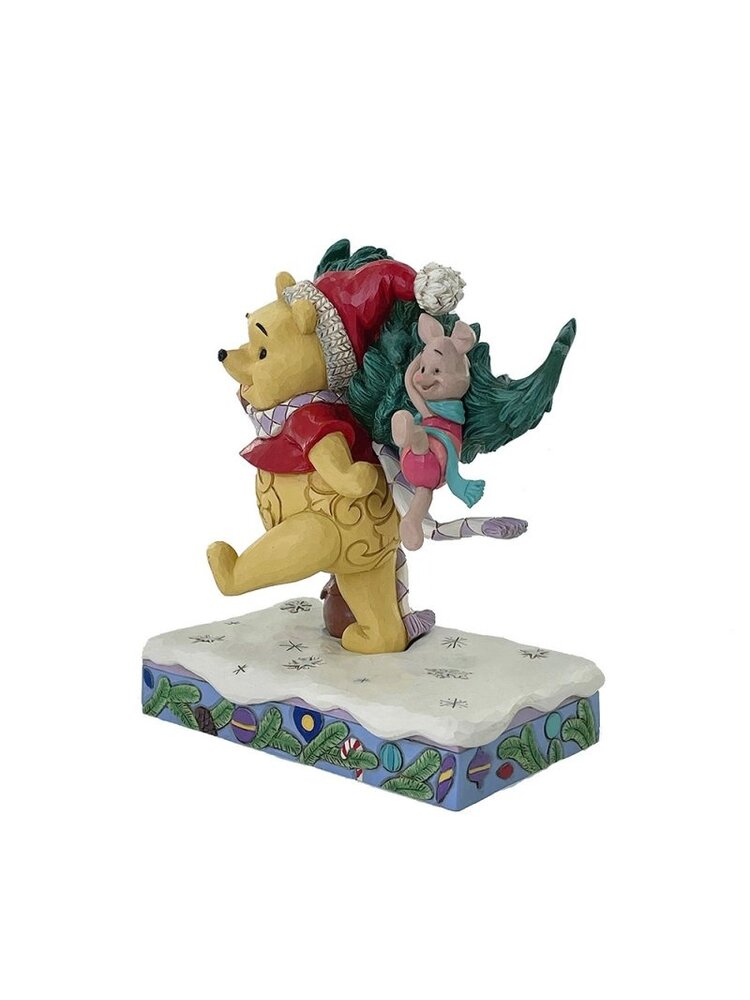 In this delightful Jim Shore scene, Winnie the Pooh sports intricate rosemaling and a Santa hat adorned with holly as he joyfully carries home a Christmas tree with Piglet in tow. They march through the snow on a festive stage of ornaments.