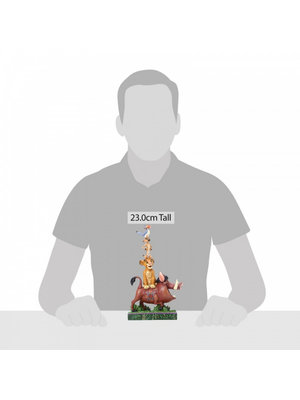 Simba just can't wait to be king, mimicking the classic musical scene from The Lion King, Pumba, Simba, Timon, and Zazu create a towering stack of Friends. In classic Jim Shore style, these four bear bright smiles, and each other's weight. Unique variations should be expected as this product is hand painted. Packed in a branded gift box. Not a toy or children's product. Intended for adults only.