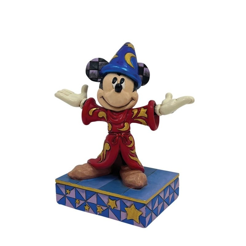 Celebrating the 85th anniversary of Fantasia in 2025, this Jim Shore Mickey Mouse is striking in red robes adorned with real gold cord and intricate rosemaling. With his sorcerer's hat, Mickey embodies the magic and wonder of the beloved classic.
