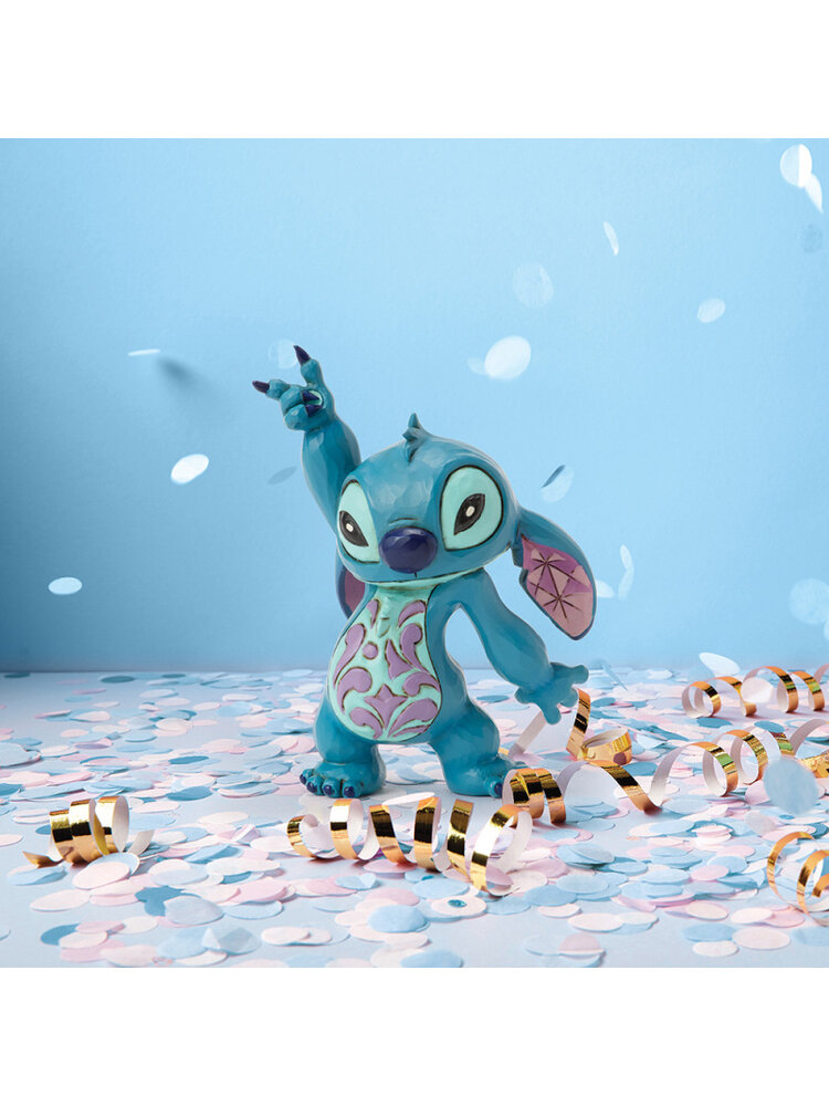 This lively Jim Shore design captures Stitch's playful spirit as he dances with rosemaling on his belly and patterned ears. Whether it's the hula or Elvis, his carefree moves are full of charm and mischief.
