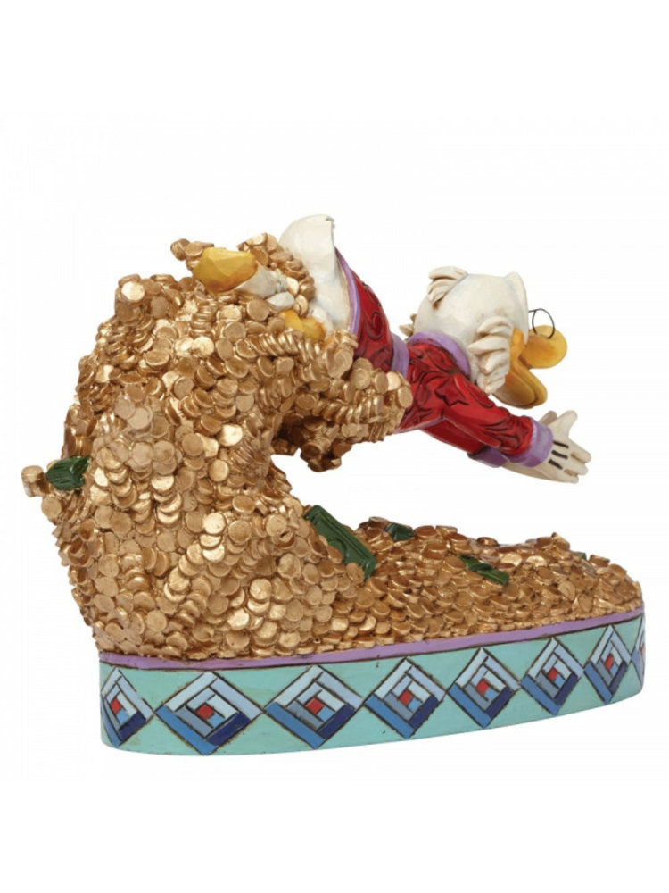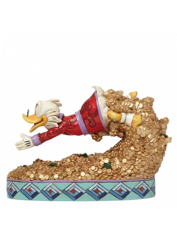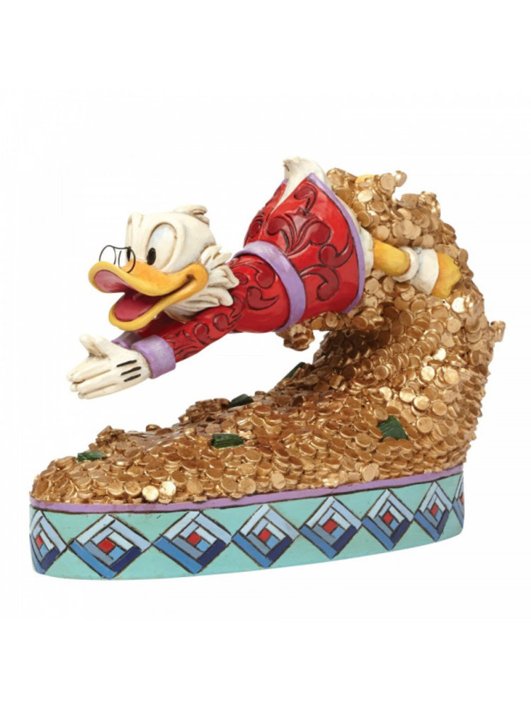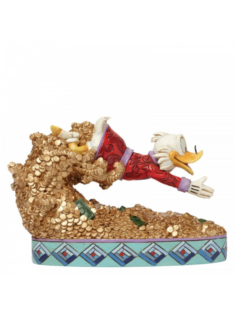 Uncle Scrooge is famous for diving into his into his vast wealth and this figurine captures the iconic scene beautifully with its unique colour palette. Designed by award winning artist and sculptor, Jim Shore for the Disney Traditions brand. The figurine is made from resin. Packed in a branded gift box. Unique variations should be expected as this product is hand painted. Not a toy or children's product. Intended for adults only.