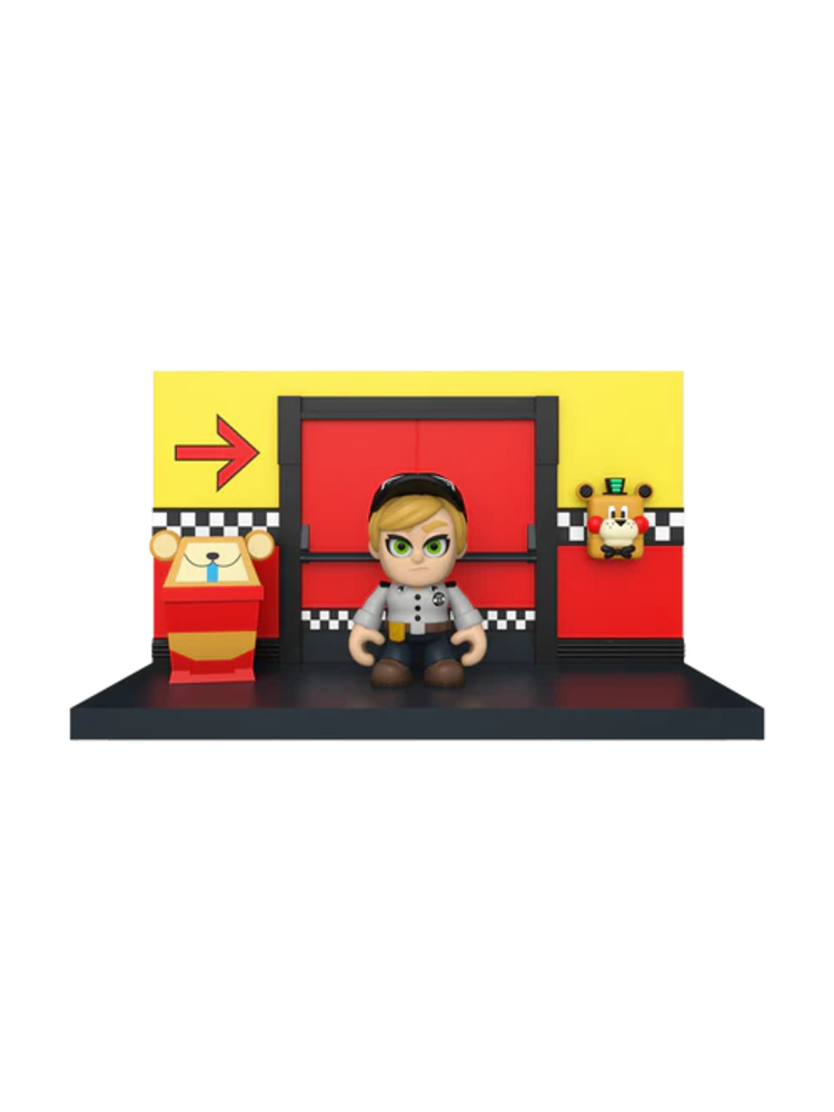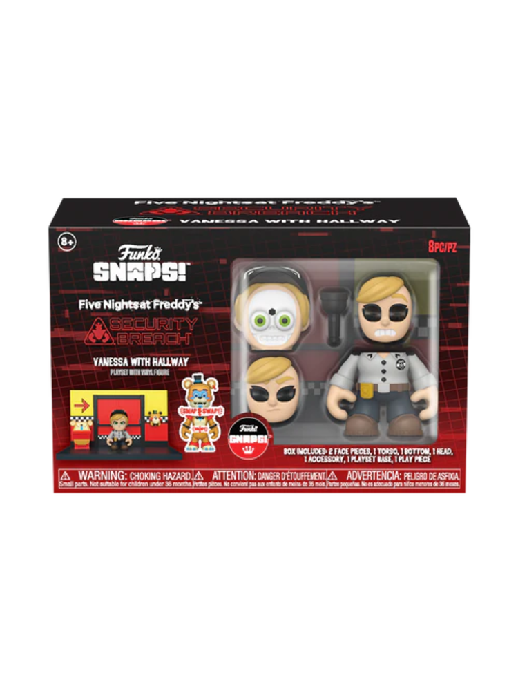 Rock ‘n roll with SNAPS! Vanessa in Hallway Playset! The Hallway Playset with Vanessa comes with 8 customizable pieces, including 2 face pieces, 1 torso, 1 pair of legs, 1 head, 1 accessory, 1 play piece, and 1 playset base. The play piece included is a trash can, which can be moved to customize each playset. You can collect and connect playsets to create even more scary fun adventures in your Five Nights at Freddy’s: Security Breach™ collection. Vinyl SNAPS! Vanessa is approximately 8.9 cm tall. Approximate Dimensions of the Playset: W 21.8 cm x H 12.9 cm x D 10 cm. Warning: Choking Hazard. Collectible comes with small parts. Not for children under 8 years.