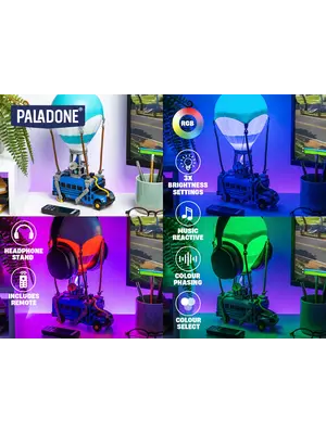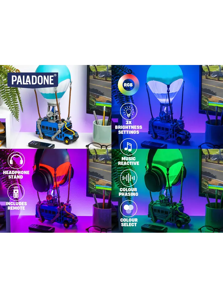 Illuminate your home, gaming setup or bedroom with this awesome Battle Bus Light. Standing at 32cm (12.6") tall, this multi-functional light-up model is inspired by Fortnite's Battle Bus and is ready to take your gaming experience to epic heights. Keep your headset ready for action with the built-in headphone stand. The hot air balloon forms the light itself and features three brightness settings, music reactive mode, colour phasing and colour select modes. Power the light with the attached USB cable. The Battle Bus Light is perfect for creating an immersive gaming space for your next Fortnite session.