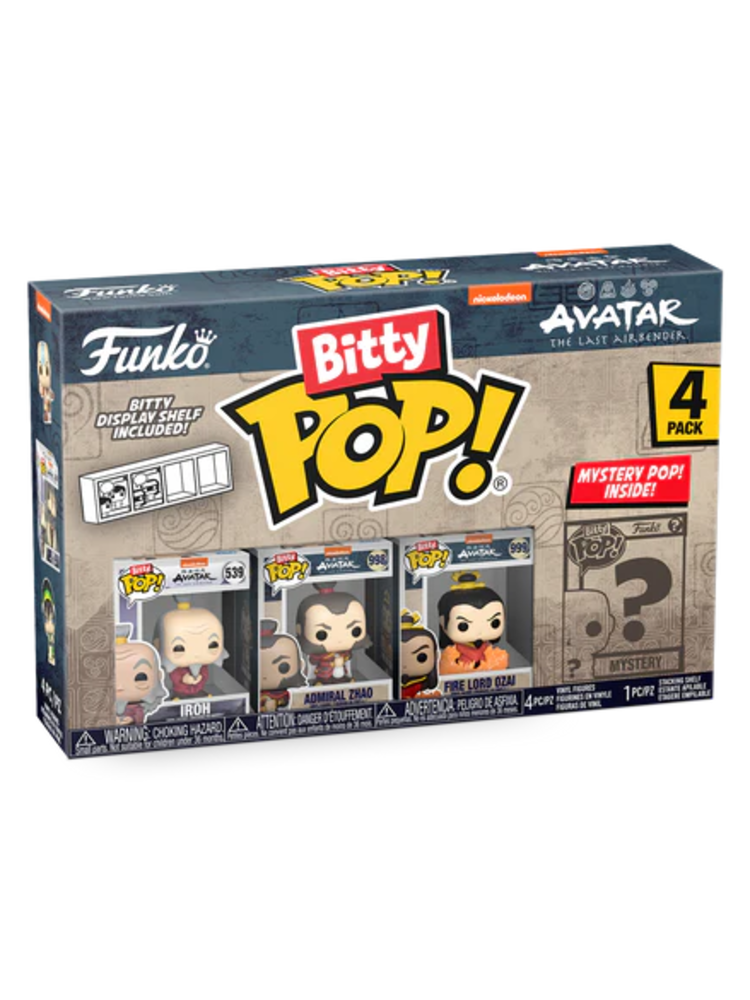 Your favourite Avatar: the Last Airbender™ Pops! have been shrunk into Bitty Pops! Expand your collection with this assortment of Bitty Pop! figures featuring your most beloved benders, non-benders, and critters as miniaturized figures! This 4-pack includes Bitty Pop! Iroh, Bitty Pop! Admiral Zhao, Bitty Pop! Firelord Ozai, and a mystery Bitty Pop! figure. The possible mystery Bitty Pops! are Hyper Rare (1/6) Iroh with lightning, Hyper Rare (1/6) King Bumi, Rare (1/3) Zuko, and Rare (1/3) Aang (floating). Bitty Pops! are packaged in hard acrylic cases with detachable bottom lids. Detachable bottom lids double as acrylic bases, to which the Bitty Pop! figures are adhered. Sort and arrange your Bitty Pops! with the included display case! Acrylic display cases are stackable and hold four Bitty Pop! figures each.