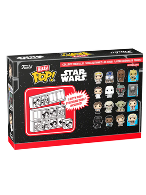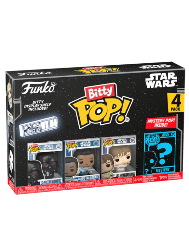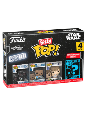 The world of POP! is getting bigger—and smaller—with Bitty POP! collectibles! Expand your Star Wars™ collection with this assortment of Bitty POP! collectibles featuring the most stellar characters in the galaxy! This 4-pack includes Bitty POP! Darth Vader™, Bitty POP! Lando Calrissian™, Bitty POP! Luke Skywalker™ and Yoda™, and a mystery Bitty POP! figure. The possible mystery Bitty POP! collectibles are Hyper Rare (1/6) Han Solo™ in Carbonite, Hyper Rare (1/6) Bossk™, Rare (1/3) Princess Leia™ (Bespin), and Rare (1/3) Han Solo™ (Hoth).