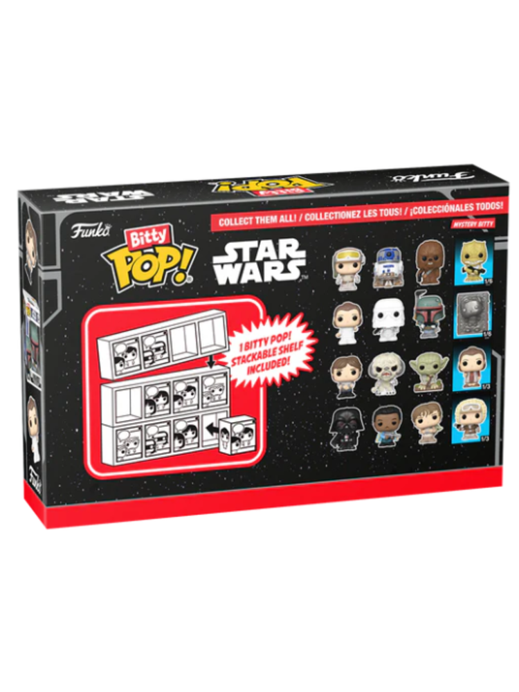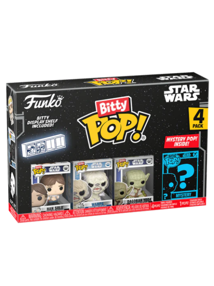 The world of POP! is getting bigger—and smaller—with Bitty POP! collectibles! Expand your Star Wars™ collection with this assortment of Bitty POP! collectibles featuring the most stellar characters in the galaxy! This 4-pack includes Bitty POP! Han Solo™, Bitty POP! Wampa™, Bitty POP! Dagobah Yoda™, and a mystery Bitty POP! figure. The possible mystery Bitty POP! collectibles are Hyper Rare (1/6) Han Solo™ in Carbonite, Hyper Rare (1/6) Bossk™, Rare (1/3) Princess Leia™ (Bespin™), and Rare (1/3) Han Solo™ (Hoth™).