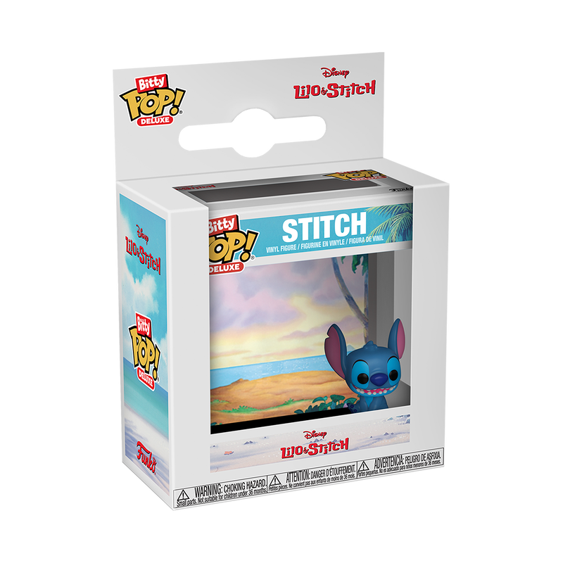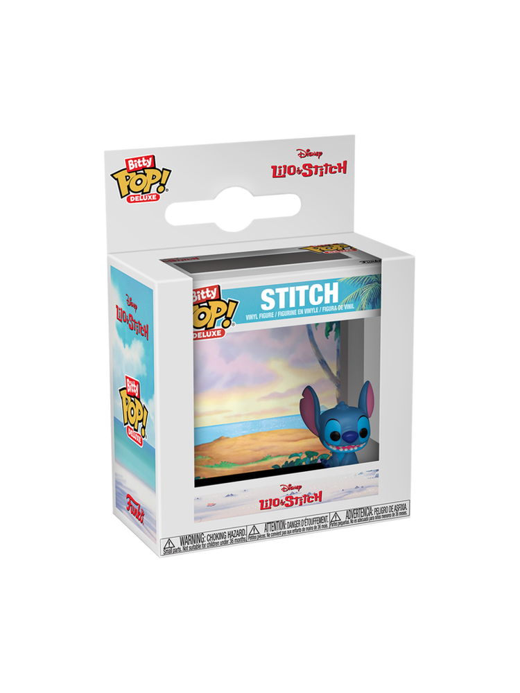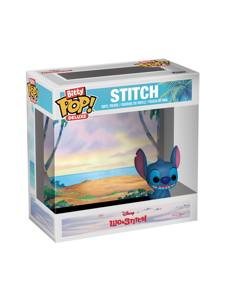 _x000D_Expand your Disney collection with this Deluxe Bitty POP! Stitch! Packaged in a hard acrylic display case, this Bitty POP! Stitch stands out against a matching backdrop of the beach! The Bitty POP! figure is adhered to an acrylic base that can be removed from the display case. The display case also includes an extra space for you to add another of your favourite Bitty POP! characters to the scene! Mix and match for endless combinations! Vinyl figure is approximately 2.2 cm tall. Acrylic display case is approximately W 6.3 cm H 6 cm x D 3.2 cm. One figure per single package purchase.