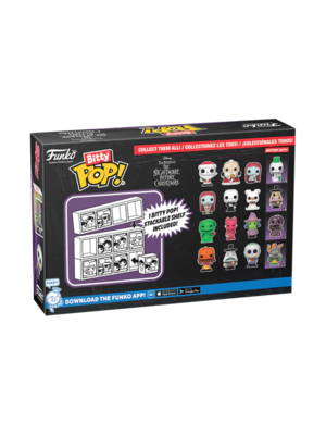 _x000D_Your favourite Pops! have been shrunk into Bitty Pops! Expand your The Nightmare Before Christmasâ„¢ collection with this assortment of Bitty Pop! figures featuring your most beloved Halloween Town residents! This 4-pack includes Bitty Pop! Pumpkin King, Bitty Pop! Mayor (frowning), Bitty Pop! Barrel, and a mystery Bitty Pop! figure. The possible mystery Bitty Pops! are Hyper Rare (1/6) Mayor (smiling), Hyper Rare (1/6) Snowman Jack, Rare (1/3) Oogie Boogie (with bugs), and Rare (1/3) Harlequin Demon. Bitty Pops! are packaged in hard acrylic cases with detachable bottom lids. Detachable bottom lids double as acrylic bases, to which the Bitty Pop! figures are adhered. Sort and arrange your Bitty Pops! with the included display case! Acrylic display cases are stackable and hold four Bitty Pop! figures each.