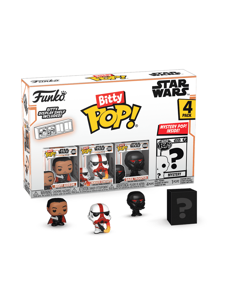 _x000D_Your favorite Star Wars: The Mandalorianâ„¢ Pops! have been shrunk into Bitty Pops! Expand your collection with this assortment of Bitty Pop! collectibles featuring the most beloved characters in the galaxy! This 4-pack includes Bitty Pop! Moff Gideonâ„¢, Bitty Pop! Incinerator Stormtrooperâ„¢, Bitty Pop! Dark Trooperâ„¢, and a mystery Bitty Pop! figure. The possible mystery Bitty Pops! are Hyper Rare (1/6) Groguâ„¢, Hyper Rare (1/6) Groguâ„¢ with cup, Rare (1/3) Groguâ„¢ with frog, and Rare (1/3) Groguâ„¢ with cookies.