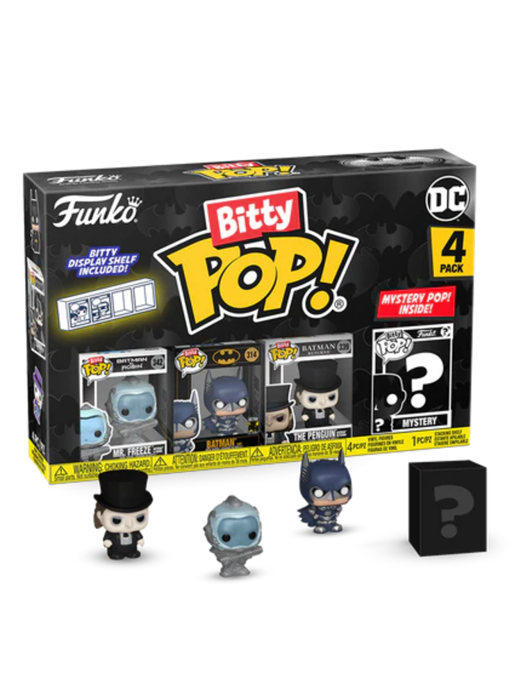 _x000D_Your favourite Pops! have been shrunk into Bitty Pops! Expand your DC collection with this assortment of Bitty Pop! figures featuring your most beloved heroes and villains! This 4-pack includes Bitty Pop! Mr. Freezeâ„¢ - Batmanâ„¢ & Robin, Bitty Pop! Batmanâ„¢ - 1997, Bitty Pop! The Penguinâ„¢ - Batmanâ„¢ Returns, and a mystery Bitty Pop! figure. The possible mystery Bitty Pops! are Hyper Rare (1/6) Batmanâ„¢ - Justice Leagueâ„¢, Hyper Rare (1/6) Batmanâ„¢ - Batman v Supermanâ„¢, Rare (1/3) The Jokerâ„¢ - Batmanâ„¢ 1989 (Makeup), and Rare (1/3) Mr. Freezeâ„¢ - Batmanâ„¢ & Robin (Metallic).
