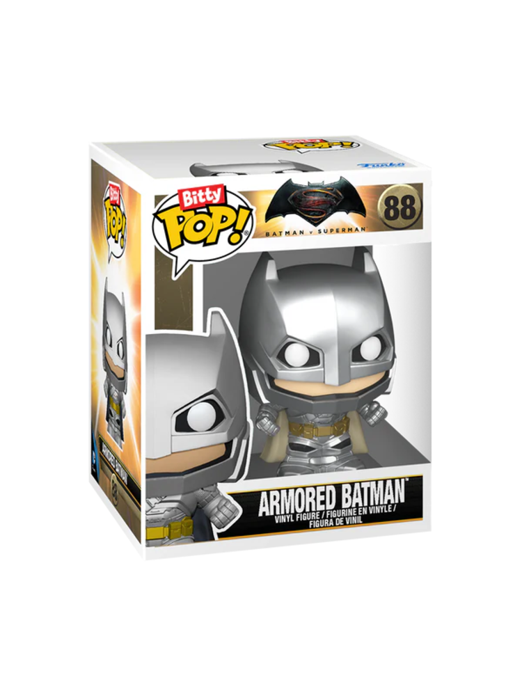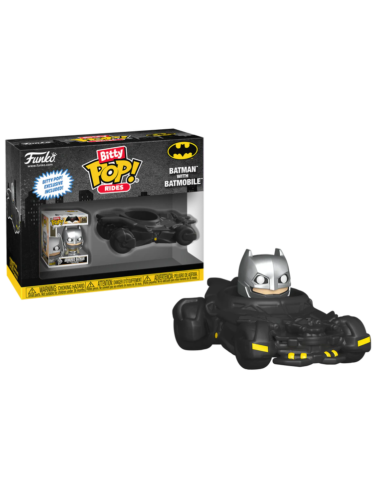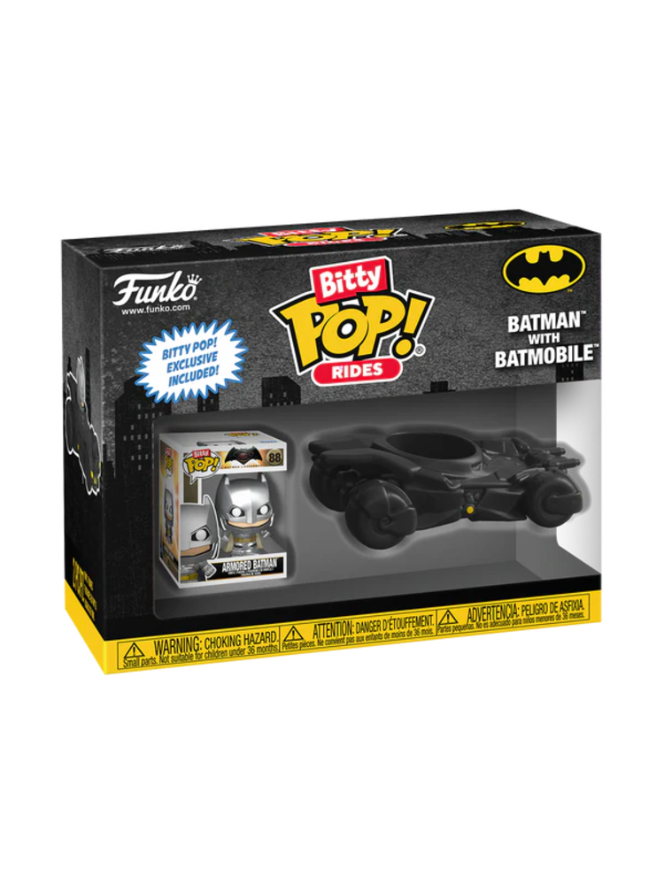 Your favourite DC POP! collectibles have been shrunk into Bitty POP! collectibles Expand your collection with Bitty POP! Ride armoured Batmanâ„¢ with Batmobileâ„¢!