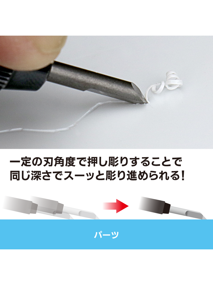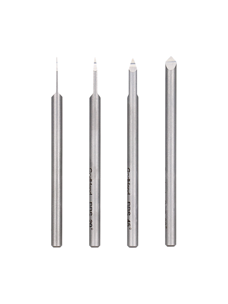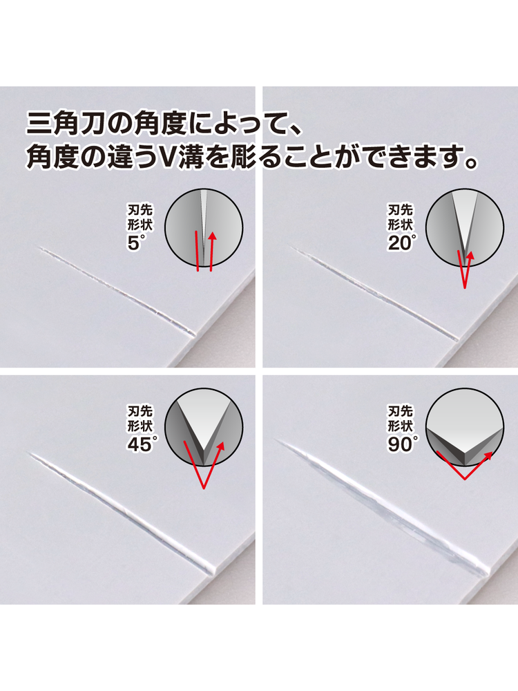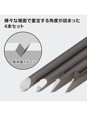 Hi precision V-shaped chisel bits of 4 pcs set.It's attachable on pin vices.You can carve smooth straight lines andcurved lines in V-shaped grooves.The engraving width changes depending on5, 20, 45, and 90 degrees angles.Shank size: 3mmBlade angle: 5, 20, 45, and 90 degreeSmall case included for storage and carriage.