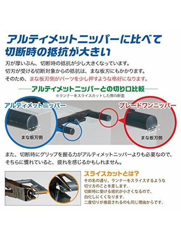 While Ultimate Nipper can cut transparent plastic up to 1 mm dia., Blade One Nipper can cut transparent plastic up to 2 mm dia.