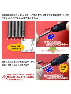 _x000D_Standardized shaft size of 3 mm. No need to change collet chucks of pin vises when replacing blades.