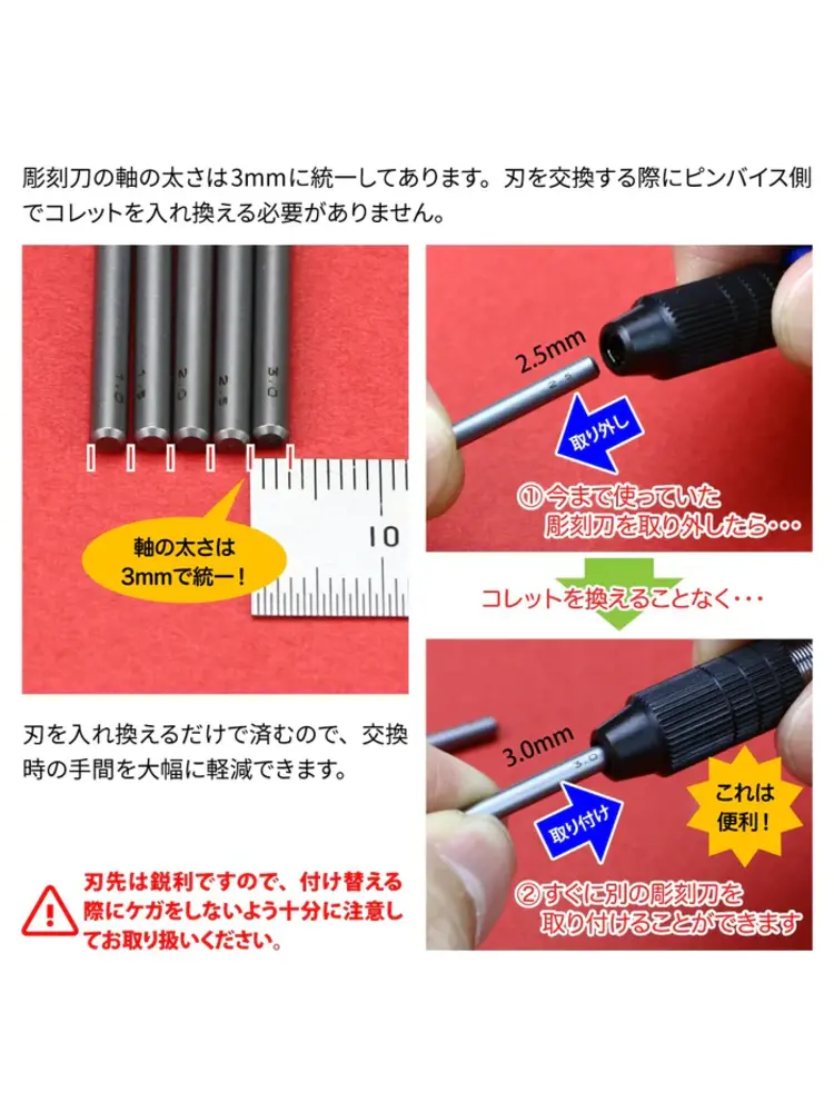 A unified 3 mm shaft enables easy replacement without changing the collet chuck of the pin vise body.