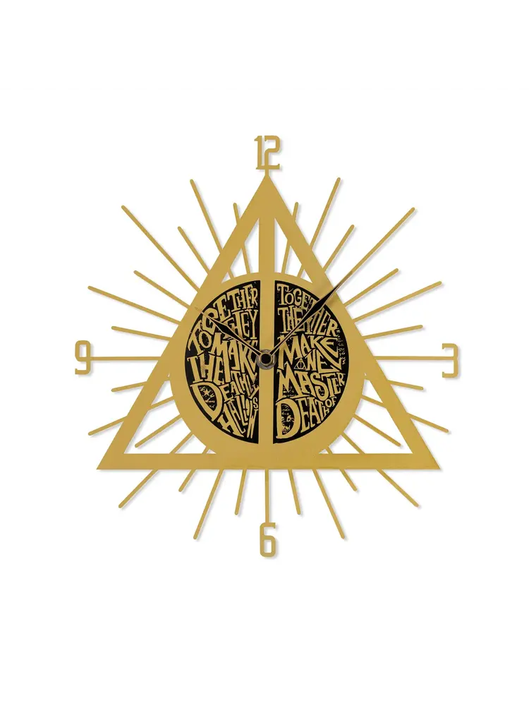 The wall clock is shaped into the Deathy Hallows and marks at 12, 3, 6 & 9 with a 2 hand dial. _x000D_