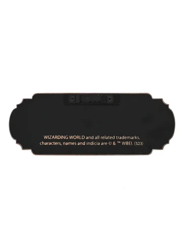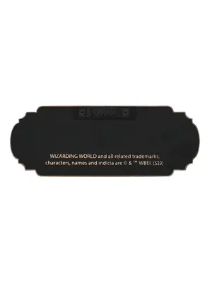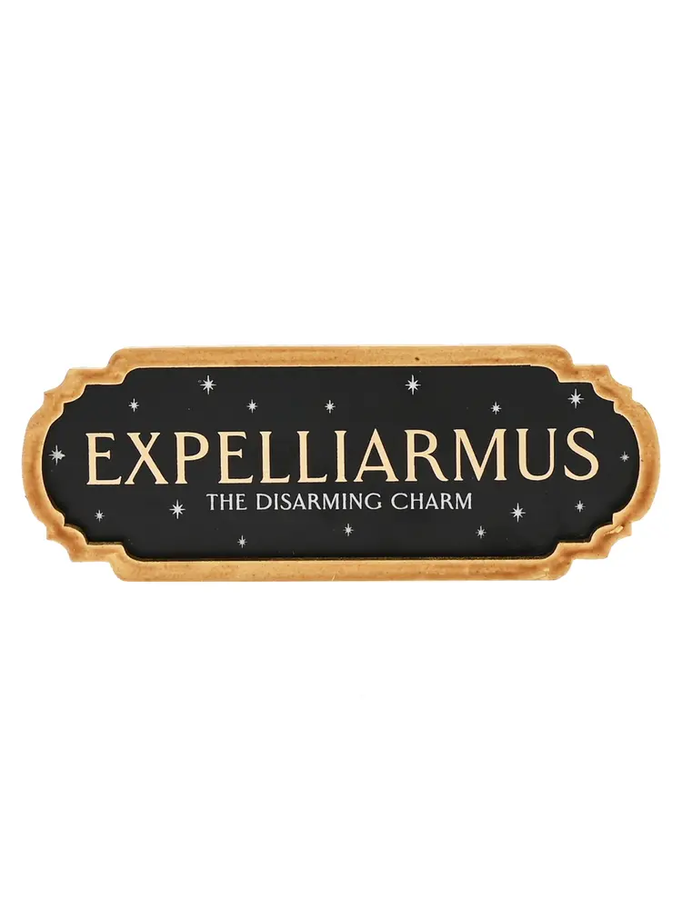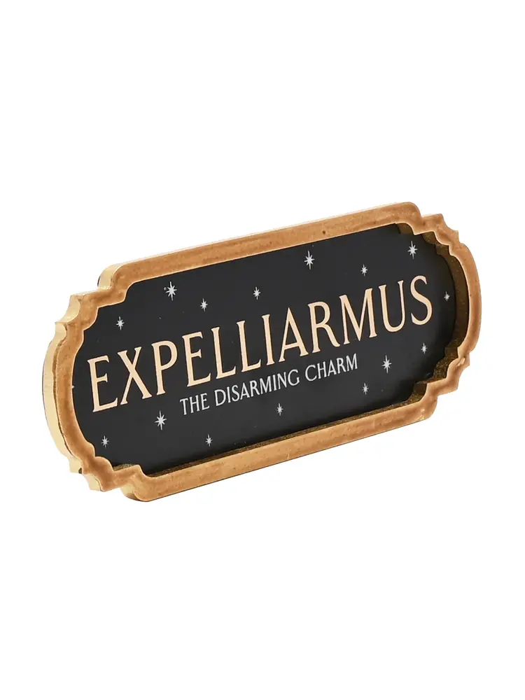 The black tin metal sign showcases a ‘glow in the dark’ starry design, complete with gold ‘Expelliarmus’ title, white ‘The Disarming Charm’ wording – which also glows in the dark - and a metallic effect finish. It is completed by a gold wooden border and hook for wall display.