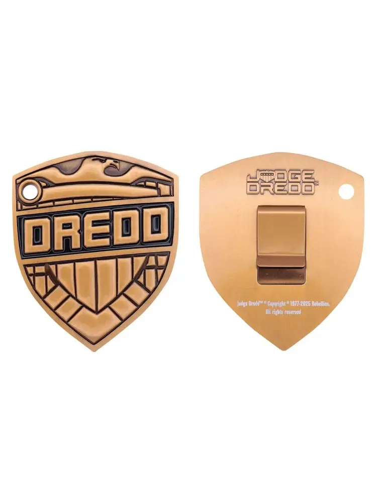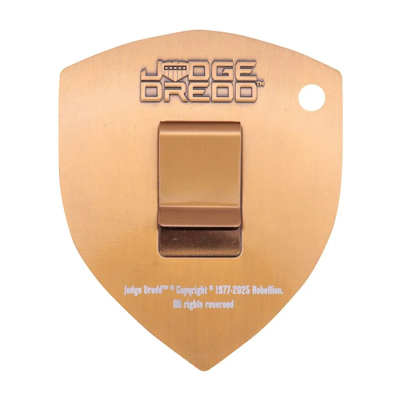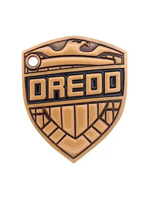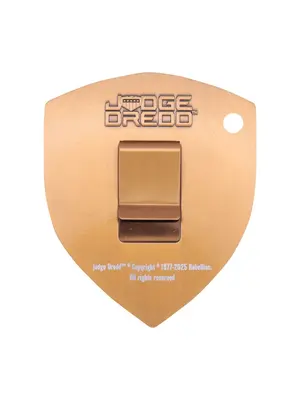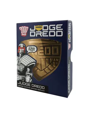 "Judge Dredd, 2000 AD's Lawman of the Future, is feared by friends and foes alike! Bring law to your home with this replica Dredd badge, measuring 90 x 74mm and plated in antique gold. Each badge is individually numbered to the reverse and also includes a belt clip. Limited to 5,000, it comes supplied with a display stand in its presentation box.
