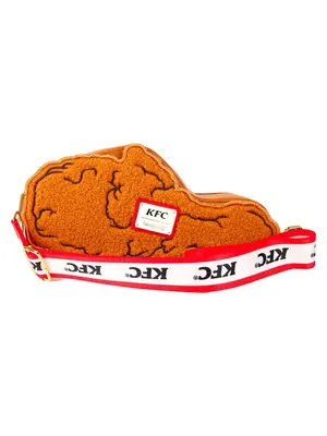 This figural crossbody bag is in the shape of one of KFC's famous wings, covered in sherpa material, and embroidered for extra detail.