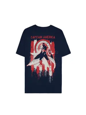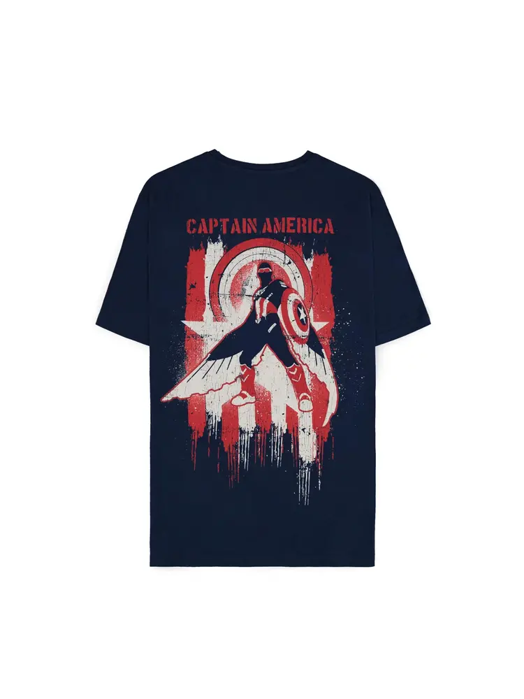 Made from 100% premium cotton in a dark navy blue hue, this t-shirt combines minimalist elegance with bold artistry. The front features a premium high-definition chest print of Captain America’s shield in a muted tone, while the back steals the show with a large, soft-pigment graphic of Sam Wilson’s Captain America. The paint streaks and splatter design add a dynamic, artistic flair that fans will love. Add the Marvel Captain America T-shirt to your Marvel merch lineup and watch fans gravitate toward this wearable tribute to Sam Wilson’s Captain America.