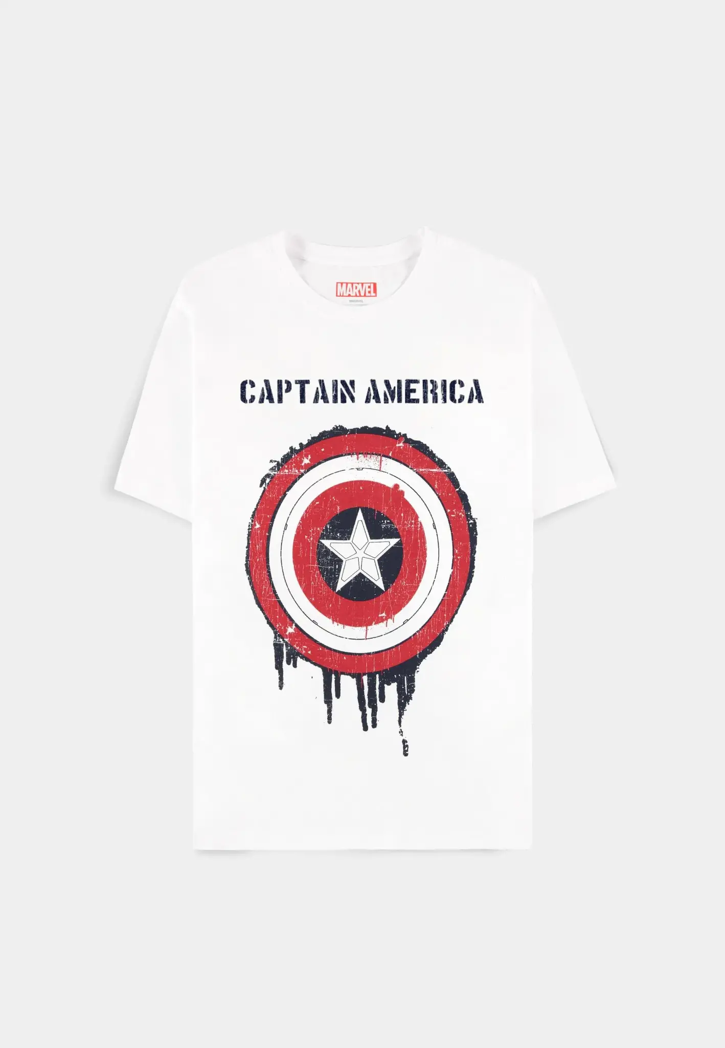 Elevate your inventory with the officially licensed Marvel Captain America T-shirt. Made from 100% premium white cotton, this t-shirt combines comfort and iconic design to deliver a fan-favorite piece of Marvel merch. The front features a striking, soft-pigment graphic inspired by Captain America, showcasing a faded artwork of his bleeding shield—a symbol of resilience and heroism that fans can’t resist. Stock up on this Marvel Captain America T-Shirt and let your customers wear their fandom with pride. A must-have addition to your Marvel merch lineup!