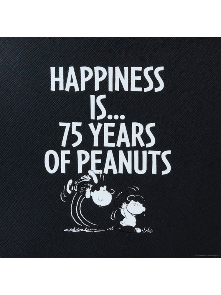 Happiness is…a big celebratory feeling you can take with you wherever you go. Celebrate the 75th anniversary of Peanuts™ with our mini backpack featuring the whole gang. You’ll be able to spot the embroidered silhouettes of Charlie Brown and his friends against a black background on the front pocket. Charlie Brown is flying a kite, and his characteristic wavy line on his shirt appears below. The signature yellow on his shirt appears above as a shiny, textured detail. The wavy line makes an encore as a die-cut feature, forming the top handle above. Flip the backpack around, and you’ll find the words “Happiness is…75 years.” Pack your daily essentials to commemorate a milestone anniversary and add a little character of your own.