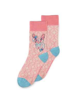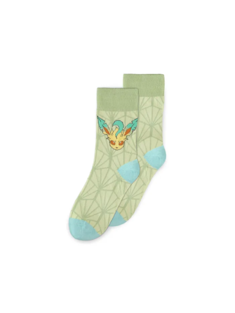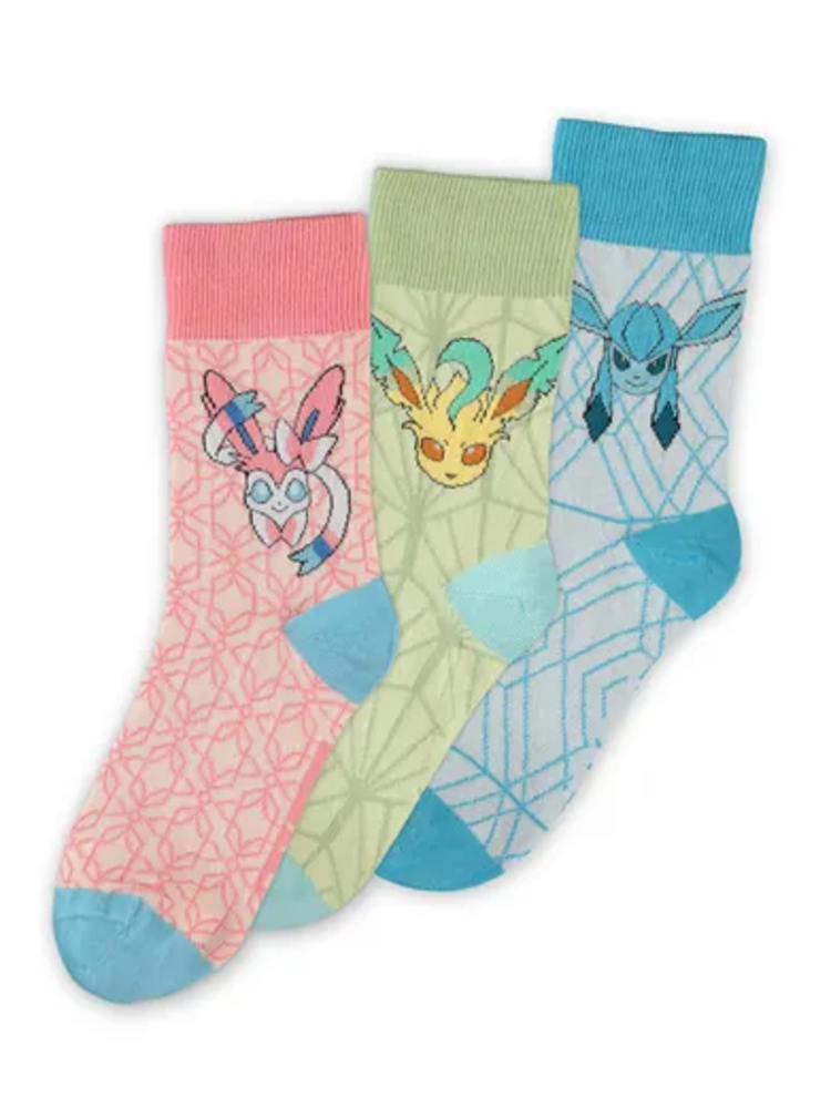 Introducing our Pokémon - Eevee Evolution Sock Giftset #3! This delightful gift set features three pairs of pastel-colored socks in blue, green, and pink. Each pair showcases one of Eevee's evolutions—Leafeon, Glaceon, and Sylveon—adorning a patterned background. With reinforced heels and toes in matching solid colors, these socks combine style and durability for the ultimate Pokémon fan experience.