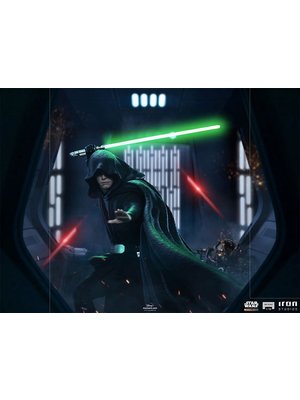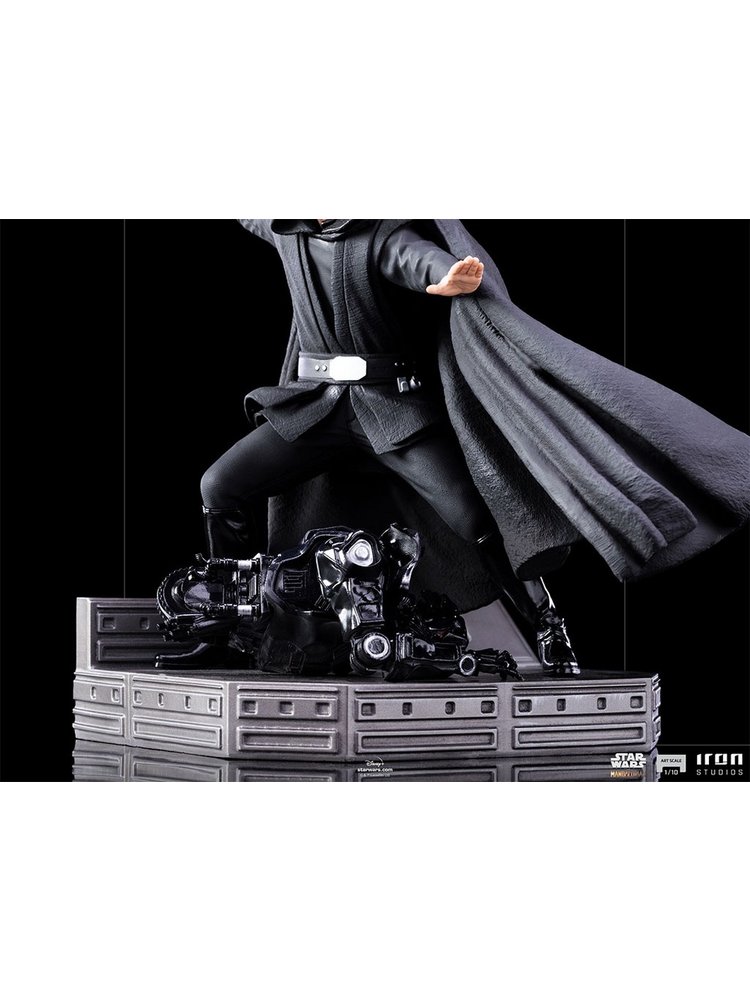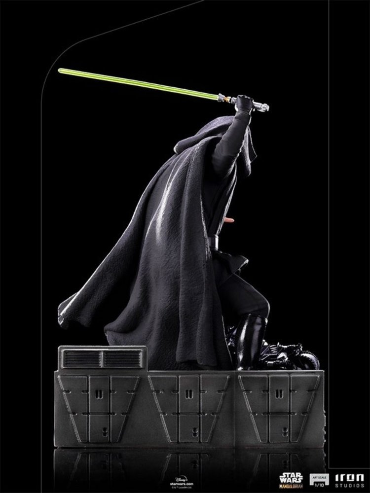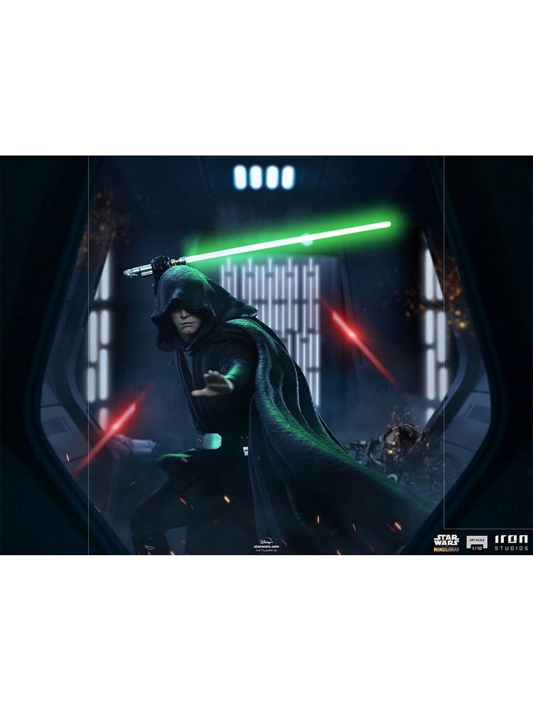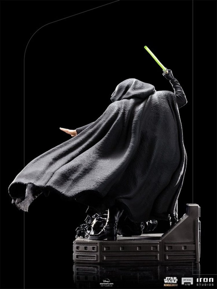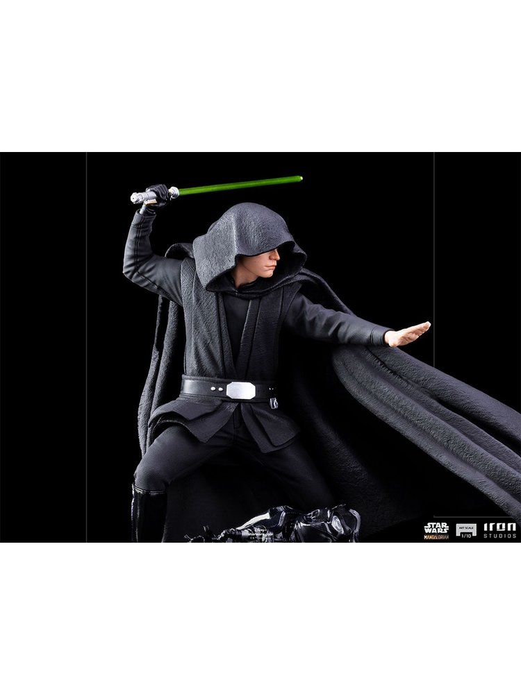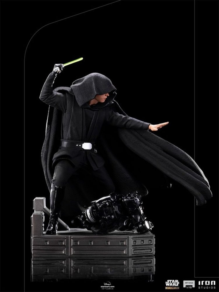 _x000D_Aboard Imperial Officer Moff Gideon's light cruiser spacecraft, the enigmatic figure of a Jedi Master, wearing a black hooded cloak, uses all his skill and connection to the power of Force with his left hand. In his right hand, with a glove, he masterfully wields a green lightsaber. At his feet lies the metallic remains of a deadly Dark Trooper droid, part of a security squad that tries in vain to stop the relentless warrior. Inspired by one of the most memorable scenes from the last episode of season 2 of the series The Mandalorian, Iron Studios presents the statue 'Luke Skywalker BDS Combat Version - Art Scale 1:10 - The Mandalorian', featuring the greatest hero of the Star Wars saga in his unexpected appearance on the Disney+ streaming series.