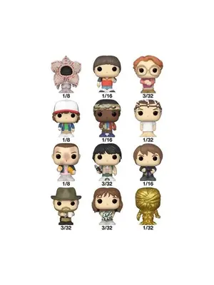 The world of POP! is getting bigger—and smaller—with Bitty POP! collectibles! Expand your Stranger Things collection with this exclusive assortment of Bitty POP! figures featuring your favorite heroes and villains! Each Bitty POP! comes in mystery packaging and includes one collectible figure. Who will you find? Demogorgon (1/8), Bitty POP! Will (1/16), Bitty POP! Barb (3/32), Bitty POP! Dustin (1/8), Bitty POP! Lucas (1/16), Bitty POP! Eleven with Electrodes (1/32), Bitty POP! Eleven with Eggos (1/8), Bitty POP! Mike (3/32), Bitty POP! Jonathan (1/16), Bitty POP! Hopper (3/32), Bitty POP! Joyce (3/32), and Bitty POP! Demogorgon (Closed Face) Gold (1/32).