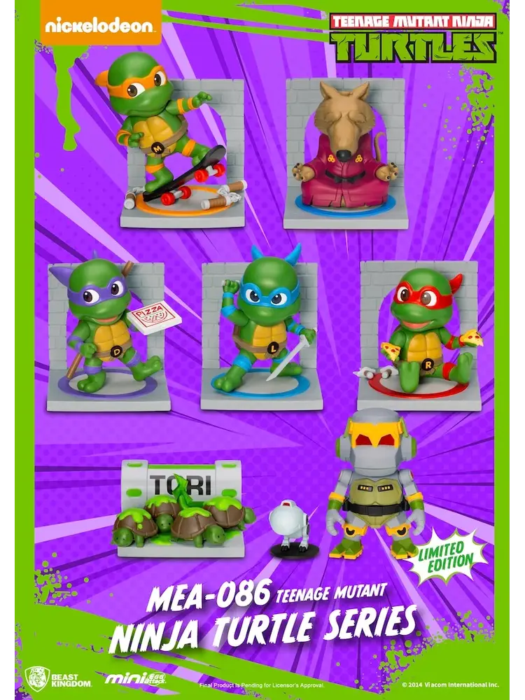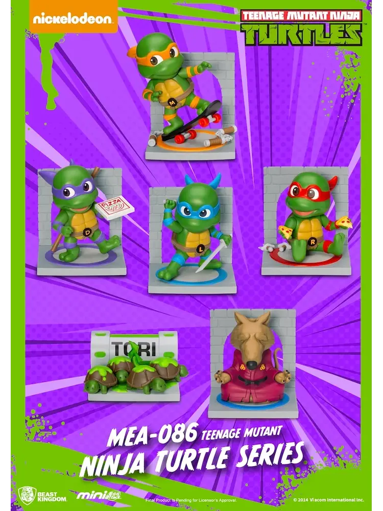 Cowabunga!! Beast Kingdom's Mini Egg Attack presents the Teenage Mutant Ninja Turtles [MEA-086 Blind Box Set]! Featuring Master Splinter, the four Ninja Turtles—Leonardo, Raphael, Michelangelo, Donatello—and the mechanical Mousers and Turtles, plus the iconic moment of the baby turtles mutating from the TCRI mutagen.