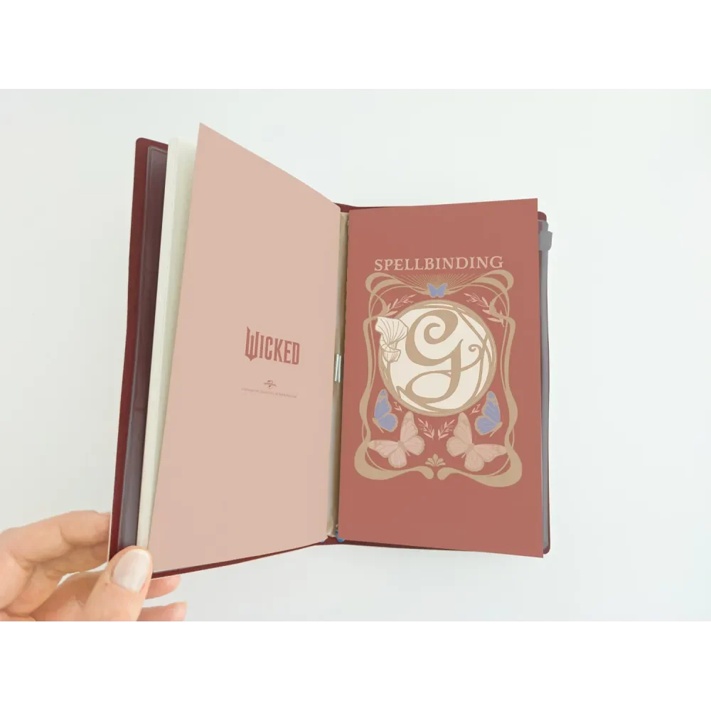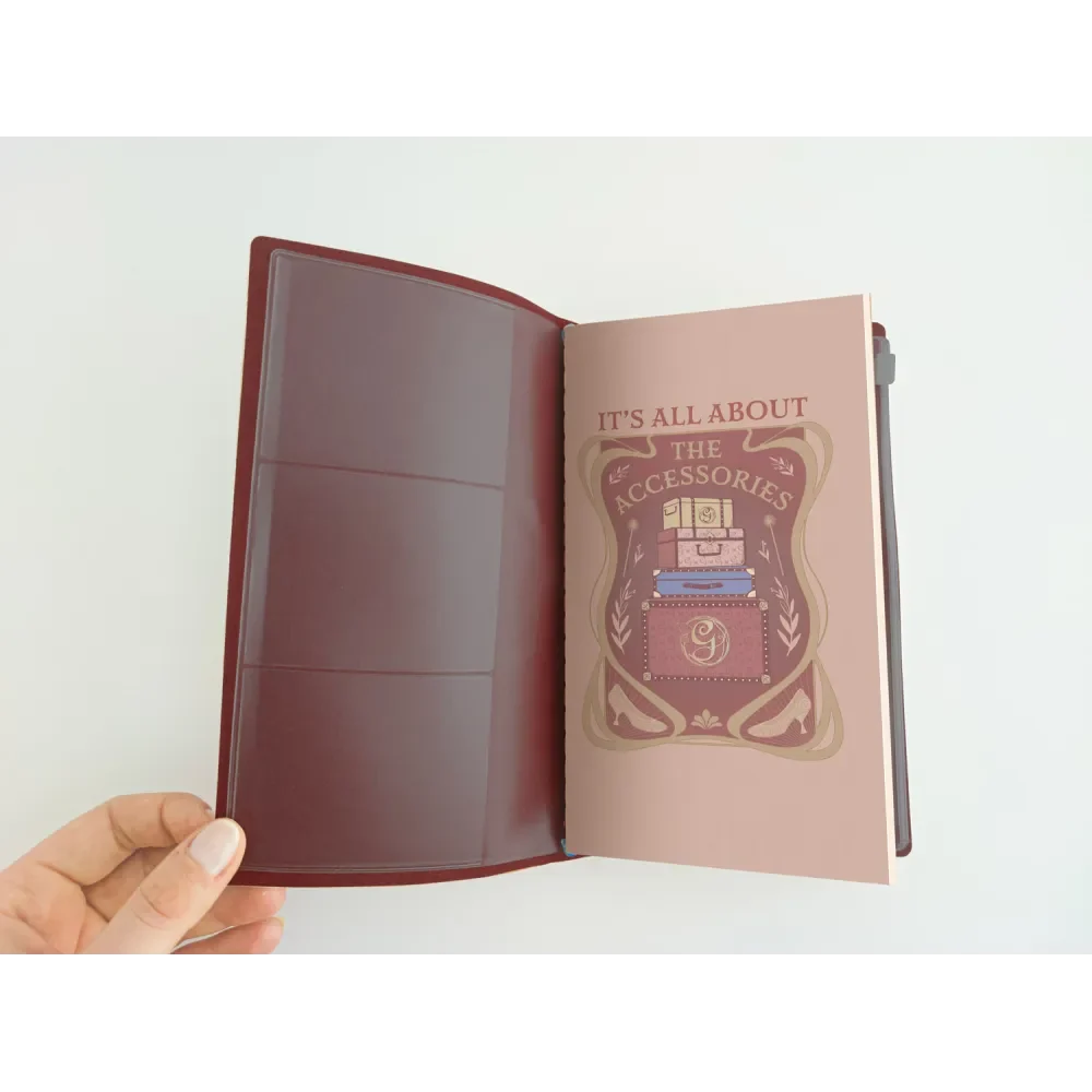 Soft-cover polyurethane travel journal. It includes space for maps, two replaceable 80-sheet (160-page) notebooks with two different types of paper (bullet points and lines) and a pocket inside the back cover. It has an e