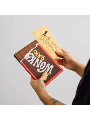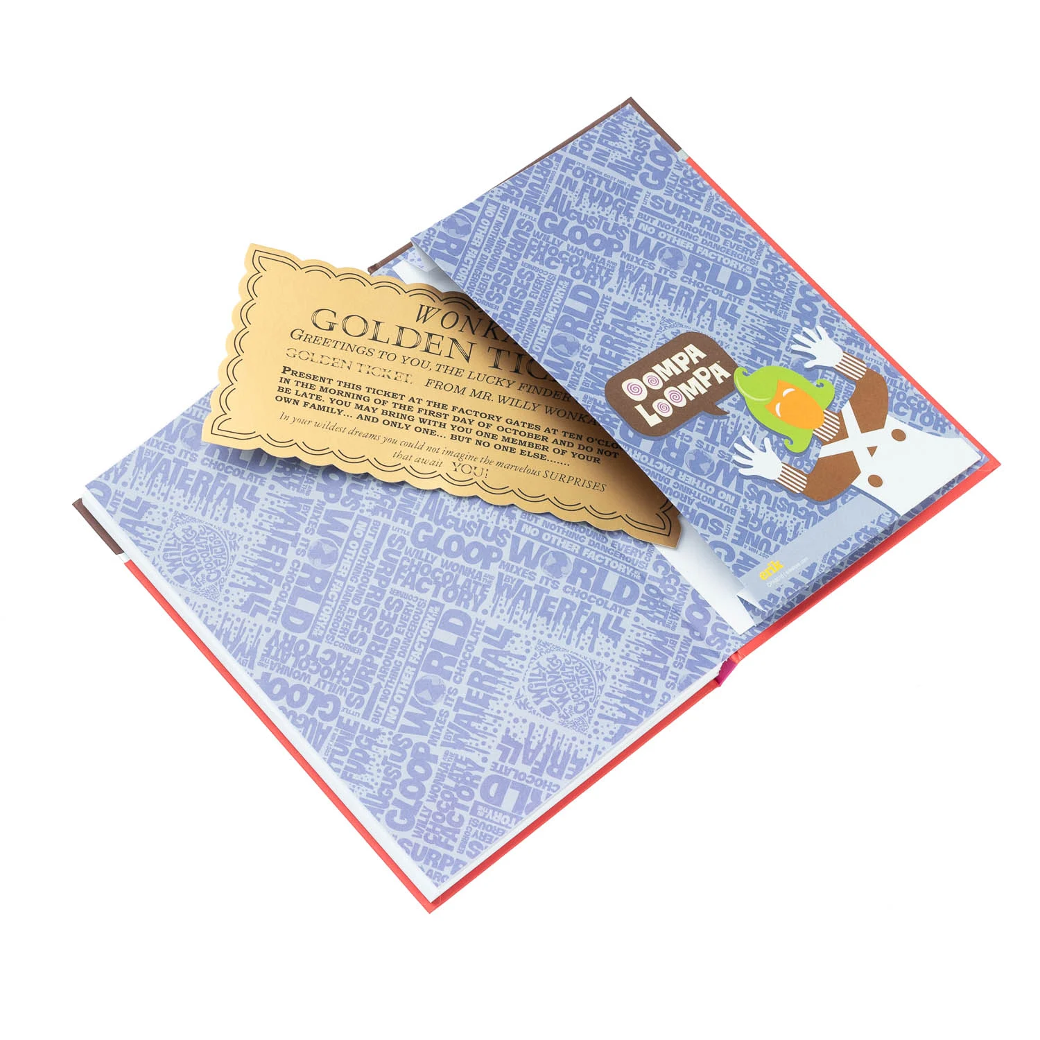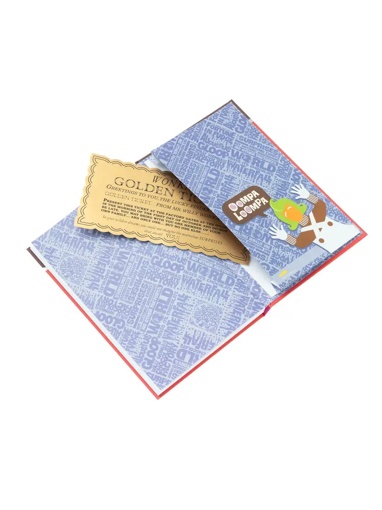 A5 notebook with a Wonka chocolate bar design with the desired golden ticket inside as a bookmark._x000D_