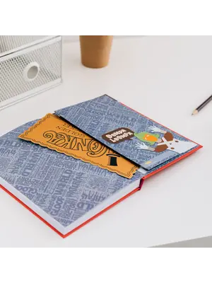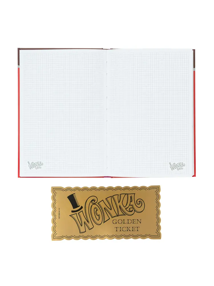 _x000D_A5 notebook with a Wonka chocolate bar design with the desired golden ticket inside as a bookmark.